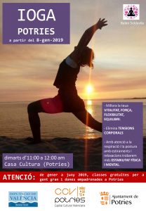 From Tuesday 8 January 2019, until June, every Tuesday from 11 to 12, at the Casa de la Cultura de Potries, yoga classes will be taught. Come and improve your vitality, strength, flexibility and balance. Eliminate body tension and with attention to breathing and posture with stretching and relaxation, you will find more physical and mental stability.